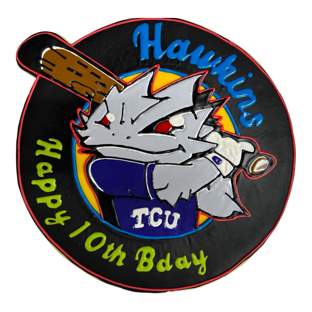 Nothing makes a statement quite like a supersize cookie cake with royal icing! Crafted from our signature sugar cookie dough, our cookie cakes can be customized to your design in either a 16" round or custom shape. Each and every cake is decorated by hand and baked fresh just for you using premium ingredients.